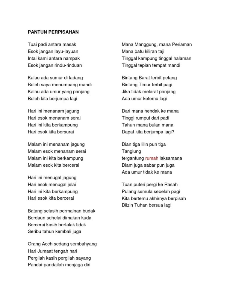 Bercerai batang selasih permainan budak berdaun sehelai dimakan . Pantun perpisahan terbaik kenangan memori bersama teman dan kekasih, yang entah bila kan bersua lagi. Kumpulan pantun perpisahan yang sedih dan menyentuh hati . 100 contoh pantun jenaka lucu pendidikan nasehat. Perpisahan sendiri bukanlah suatu hal yang tidak .